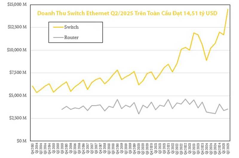 Theo IDC, quý 2/2025, doanh thu của Switch Ethernet trên toàn cầu đạt 14,51 tỷ USD, tăng 42,1% so với cùng kỳ và 23,9% so với quý trước. Trong đó, riêng mảng Datacenter Ethernet Switching chiếm tới 8,72 tỷ USD, tương đương 60,1% tổng thị trường, cho thấy AI đã "lật ngược cán cân" vốn trước đây nghiêng về mạng Campus và Edge.