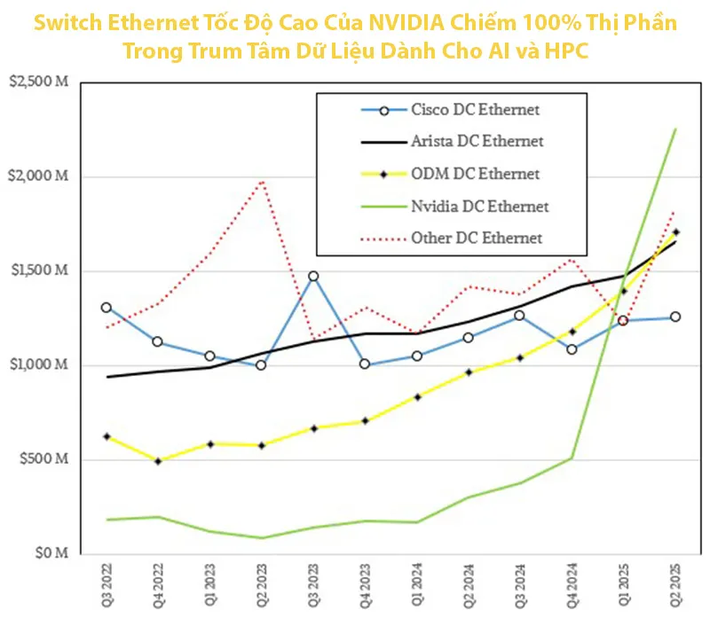 NVIDIA đã "cầm trịch" trong mảng Datacenter Ethernet Switching cho thấy chiến lược rõ ràng: không chỉ bán GPU và máy chủ AI, mà còn làm chủ toàn bộ hạ tầng từ tính toán đến truyền dẫn. Đây là lợi thế chiến lược giúp NVIDIA tạo ra một hệ sinh thái AI hoàn chỉnh, khép kín, khó bị cạnh tranh trong ngắn hạn.