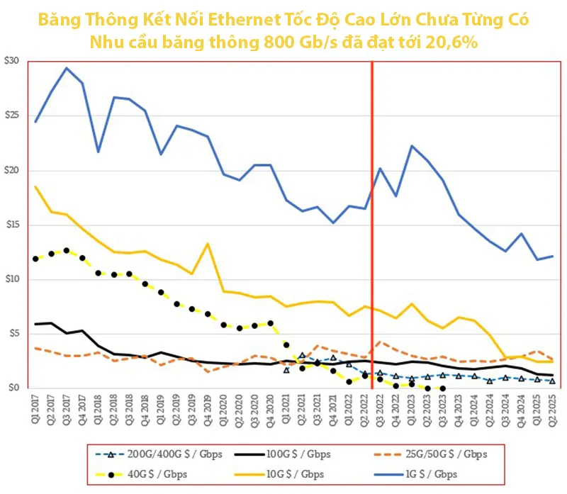 Với chi phí/bit gần tương đương 100 Gb/s. Điều này chứng minh nhu cầu kết nối khổng lồ từ các AI cluster đang kéo toàn bộ thị trường Ethernet tiến về thế hệ mới nhanh hơn bao giờ hết.